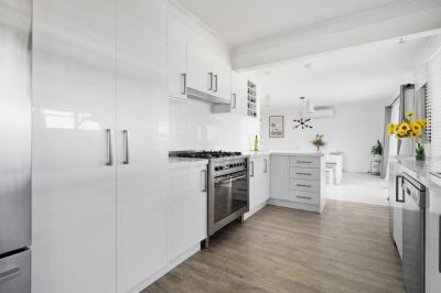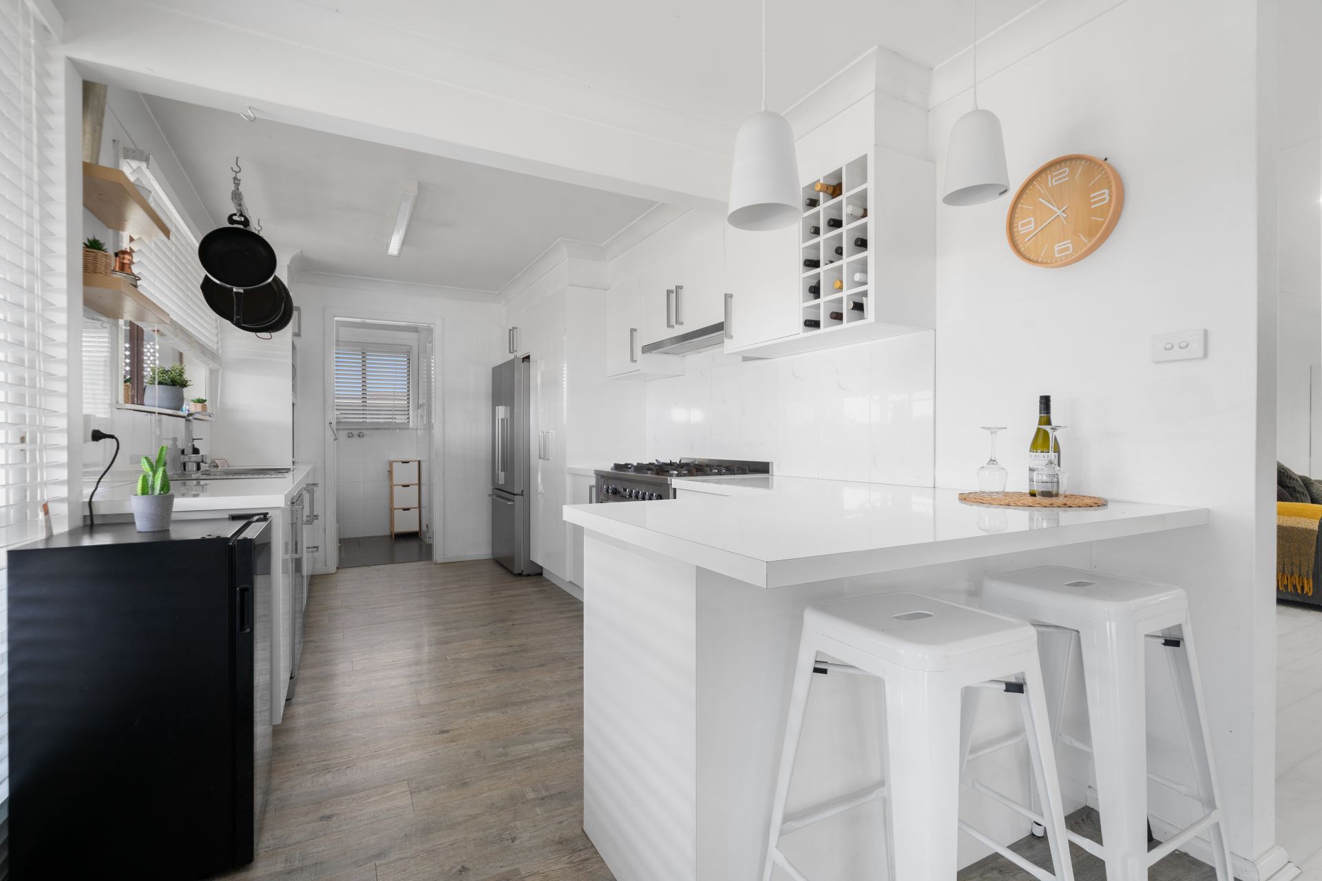 - The kitchen boasts a wide galley-style layout with stainless steel appliances, a gas cooktop, and a breakfast bar-ideal for tenants seeking modern conveniences.