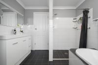 - Sleek bathroom features a wide shower and deep bathtub.